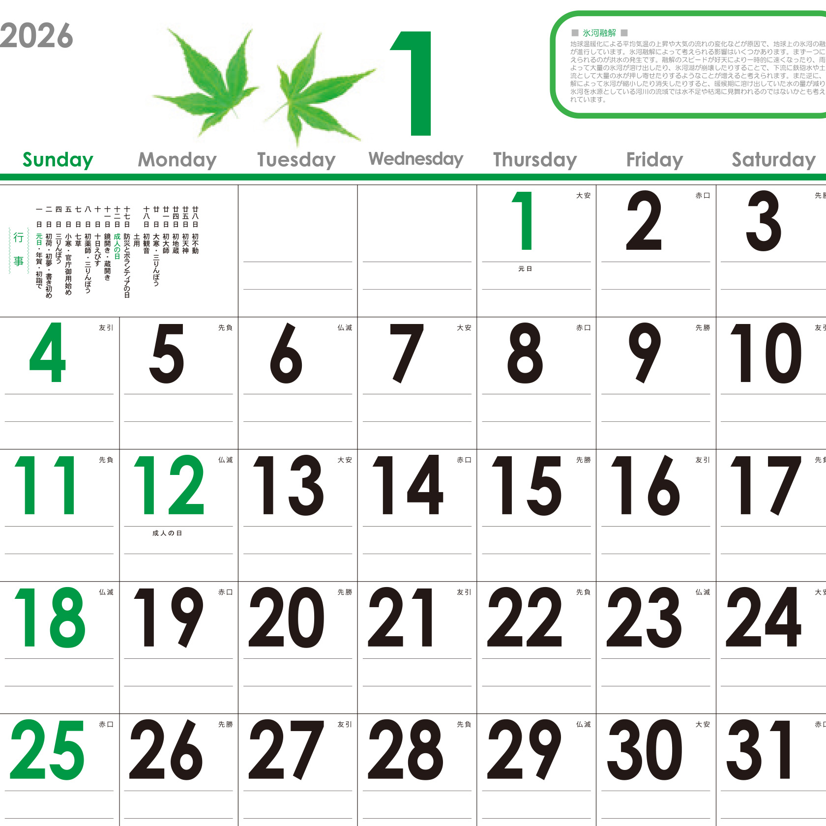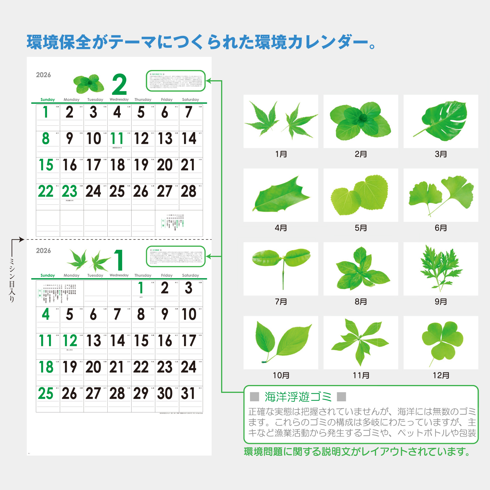 毎月の上部に環境問題に関する説明文がレイアウトされています。この先も考え続けなくてはいけない環境問題ですが、
