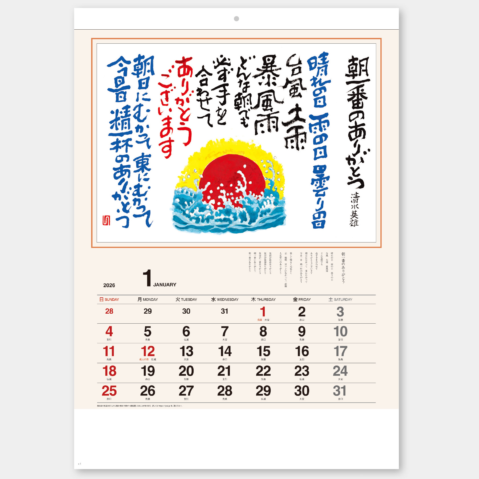 12か月、季節に合わせた書とイラストが半面に掲載されています。3か月分の前後月表記、年齢早見表があります。